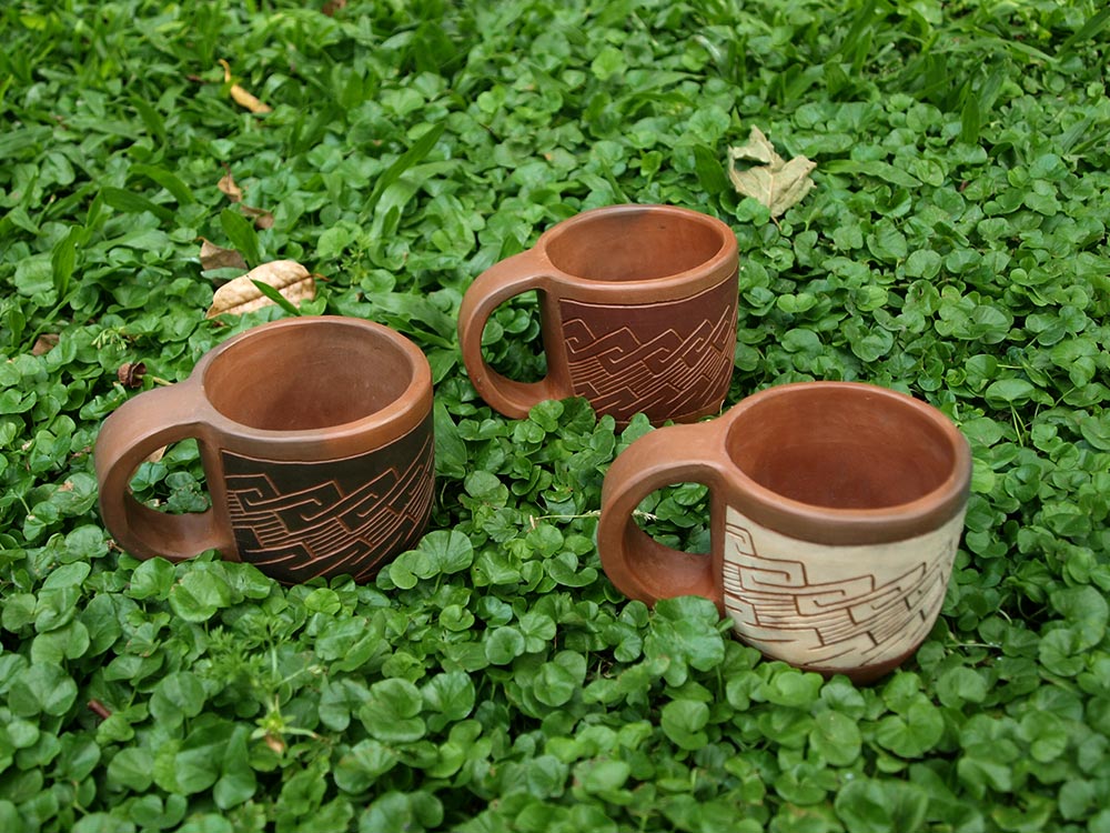 Tazas modeladas totalmente a mano desde bollo sin usar torno ni esmaltes, horneadas a leña e impermeabilizasdas con cera de abejas.